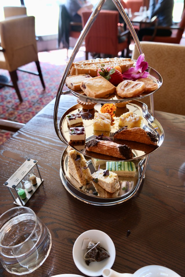 Zunächst stellt sich unsere persönliche Bedienung vor, warum die alle einen Schottenrock tragen, konnten wir nicht herausfinden. Jane erklärt uns jede der 20 Teesorten eingehend, als hätte sie jedes Teeblatt in Händen gehabt. Dann gibt es als Appetitanreger Scones mit Cream und Marmelade. Und dann diese Etagere, die von unten nach oben verputzt wird. Da kommt zuerst das Herzhafte und dann das Süße.