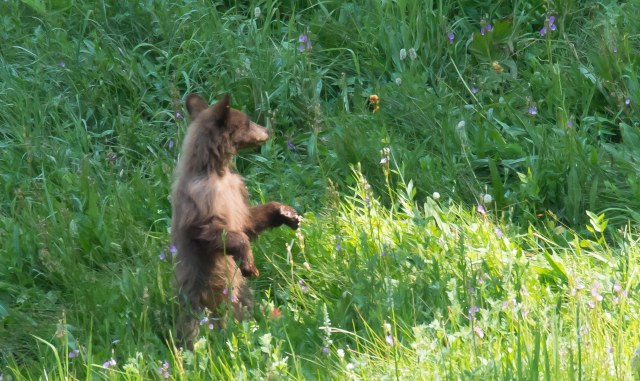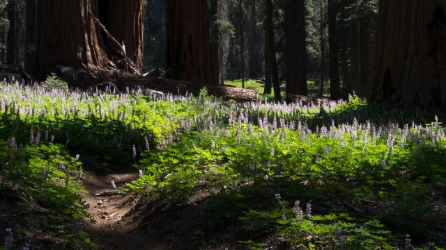 In den Redwoods haben wir die höchsten Bäume gesehen, im Kings Canyon und Sequoia National Park stehen die mächtigsten. Die Redwoods sind so schlank, dass man manchmal Bedenken hat, ob sie den nächsten Sturm überstehen. Ganz anders die Sequoias, sie stellen das Längenwachstum ein, wenn sie die umliegenden Bäume überragen. Dann bilden sie eine dichte Krone aus und die braucht viel Sonne. Die Sequoias werden um die 90 Meter hoch und haben einen Umfang von bis zu 30 Metern. Sie legen jedes Jahr an Umfang zu, auch wenn sie nicht mehr in die Länge wachsen. Aber nicht nur die Bäume haben es uns angetan, die Wälder sind sonnendurchflutet, die Bäume stehen weit auseinander und lassen viel Licht durch. Momentan bilden die Lupinen einen blauen Blütenteppich soweit das Auge reicht. Und dann haben wir auf unserer Wanderung auch noch einen jungen Bären gesehen, der sich friedlich durch eine Blumenwiese gefuttert hat.