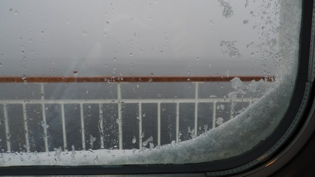 Schnee am Kabinenfenster