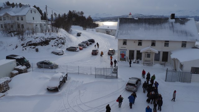 Der Anleger in Finnsnes, unser Schiff ist ja eigentlich eine Fähre und Leute steigen aus und ein.