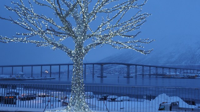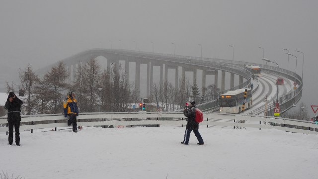 Wenn man es mal über den Polarkreis geschafft hat, dann kann es nur noch kalt werden. Und der Winter hat eine andere Farbe als bei uns, hier gibt es kein Einheitsgrau. Die Farbe des Winters in Nordnorwegen ist weiß, sieht irgendwie freundlicher aus. Man kann sich gar nicht satt sehen an den tief verschneiten Bergen. Und immer, wenn ich denke, hier lebt bestimmt niemand mehr, stehen mitten in der Einöde ein paar tief im Schnee versunkene Häuser. Und dann passieren wir auch mal die E 8, an deren Verlauf immer wieder kleine Ansiedlungen stehen. Imposante Brückenbauten schließen auch entlegene Inseln an das Straßennetz des Festlandes an.
