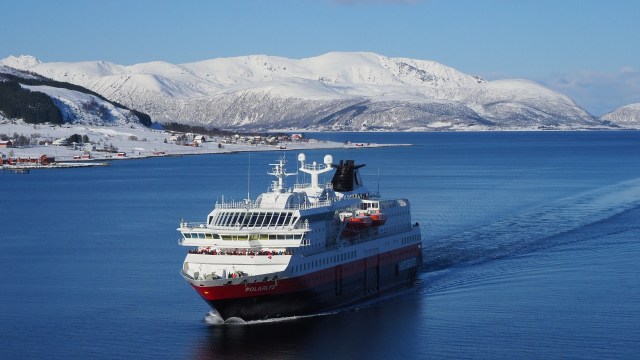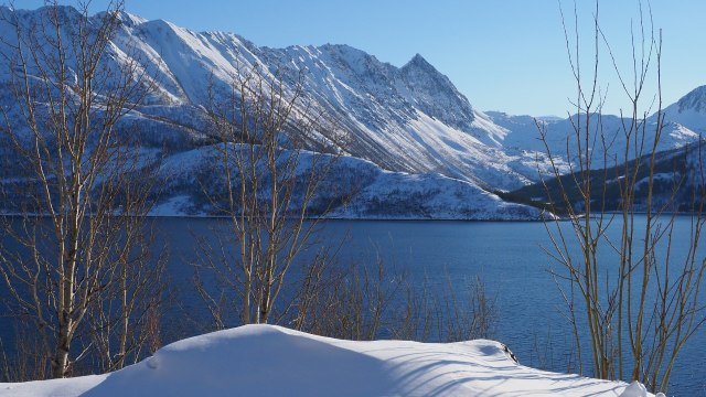 Das Wetter ändert sich hier beinahe so schnell wie die Jahreszeiten, wenn man den Worten unseres Reiseführers glaubt. Scherzhaft sagt der Norweger, wenn du aufs Klo gehst, ist Frühling und wenn du fertig bist, ist er vorbei. Wir lassen uns gern jeden Tag überraschen, wenn wir den ersten Blick nach draußen wagen. Besser hätte es heute nicht sein können. Wir haben eine Panoramafahrt mit dem Bus gebucht. Dazu verlassen wir unser Schiff in Harstadt und steigen in Sortland wieder zu. Es ist schön, mal die Perspektive zu wechseln und die Wintermärchenlandschaft an Land zu erleben. Der Schnee kam verhältnismäßig spät in diesem Jahr, erst Mitte Januar, und vor einer guten Woche stiegen die Temperaturen und es regnete sogar. Aber danach kam noch einmal gut ein Meter Schnee und deshalb ist jetzt alles so tief verschneit.
