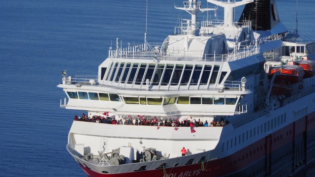 Am Nachmittag, wieder auf dem Schiff, kommen die Berge sehr nahe und unser Kapitän fädelt das Schiff in Zentimeterarbeit durch den engen Raftfjord. Da ist unser Lieblingsplatz natürlich im Panorama Salon mit Rundumsicht.