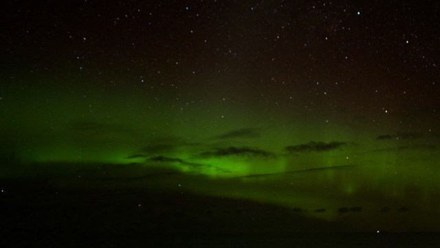 Kaum hatte ich gestern Abend den Blog abgesetzt, da kam schon die Durchsage, daß Nordlicht an der Backbordseite zu sehen sei. Natürlich habe ich mir sofort den bereitliegenden Fotoapparat und das Stativ geschnappt, dicke Jacke an und nix wie raus aufs zugige Deck. Kein Nordlicht gleicht dem anderen und diesmal breitete es sich halbkreisförmig über den gesamten Horizont aus. Ich deutete es schon an: es war bitterkalt, der Fahrtwind bläst kräftig, da bekommt man sofort klamme Finger. Gut, daß ich an den Fernauslöser gedacht hatte, da konnte ich die Hände beim Auslösen in den Taschen aufwärmen. Nordlicht sehen bedeutet naturgemäß klarer Himmel und der Sternenhimmel ist durchaus sehenswert, den sollte man vor lauter Nordlicht nicht vergessen.