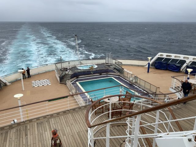 Der dritte Tag auf See. Und wir haben noch nicht die Hälfte bis New York. Bei uns geht es nicht um Schnelligkeit, sondern um Genuss. Die einen genießen das Essen, für andere zählen die Abendveranstaltungen mit Musik und Tanz, wieder andere lieben das Bridge Spiel oder Joggingrunden auf Deck 7. Baden kann man in beheizten Pools auf beiden Achterdecks oder bei schlechtem Wetter im überdachten Schwimmbad. Massage oder Sauna, Friseur oder Fitnessstudio, jeder kommt auf seine Kosten. Es gibt ruhige Lounges fürs gute Buch oder Klavierkonzerte beim Mittagessen in der Carinthia Lounge. Abends geht es hier etwas ruhiger zu, dann kann man seinen Portwein zu den Klängen einer Harfe trinken. Und wenn es zur Nachtruhe geht, wird man mehr oder weniger sanft in den Schlaf gewiegt.