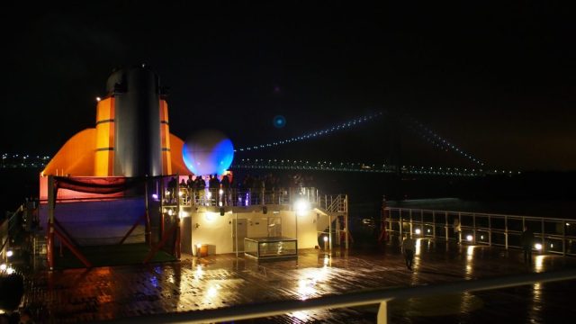 In den letzten Stunden an Bord fieberten wir natürlich der Einfahrt in den New Yorker Hafen entgegen. Allerdings mussten wir dafür auch etwas tun, nämlich sehr früh aufstehen. Bereits um 3 Uhr nachts wurden die Lotsen an Bord genommen und um 4 Uhr sind wir unter der Verrazano Brücke hindurchgefahren. Sie ist mit 1298 Metern die längste Brücke Amerikas und damit länger als die Golden Gate. Die lichte Höhe beträgt 70 Meter und da passte unser Schiffchen gerade so durch. Es waren noch 4 Meter Luft. Das Ganze ereignete sich bei völliger Dunkelheit, daher ist die Brücke auf dem Foto nicht ganz scharf geworden: