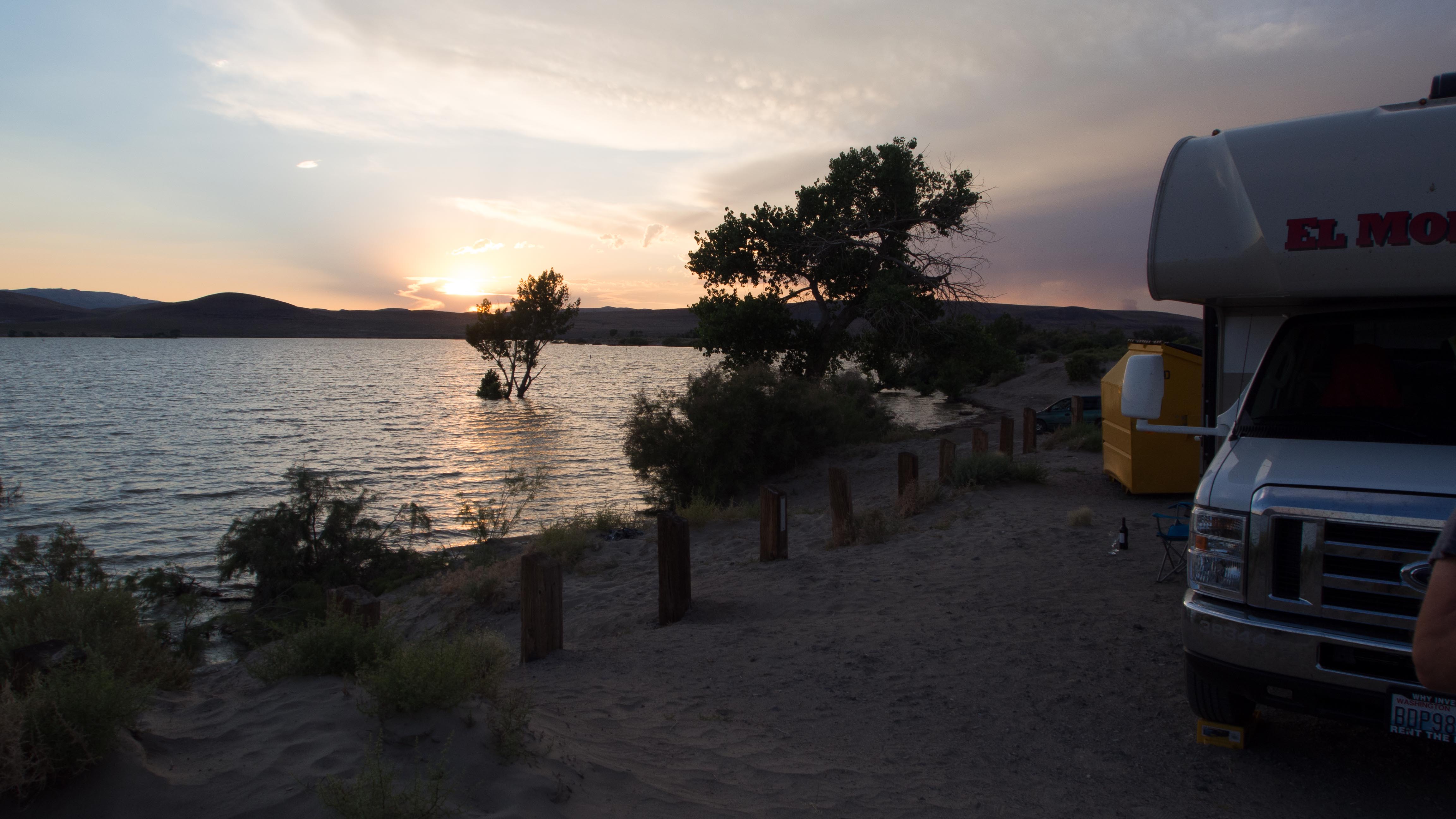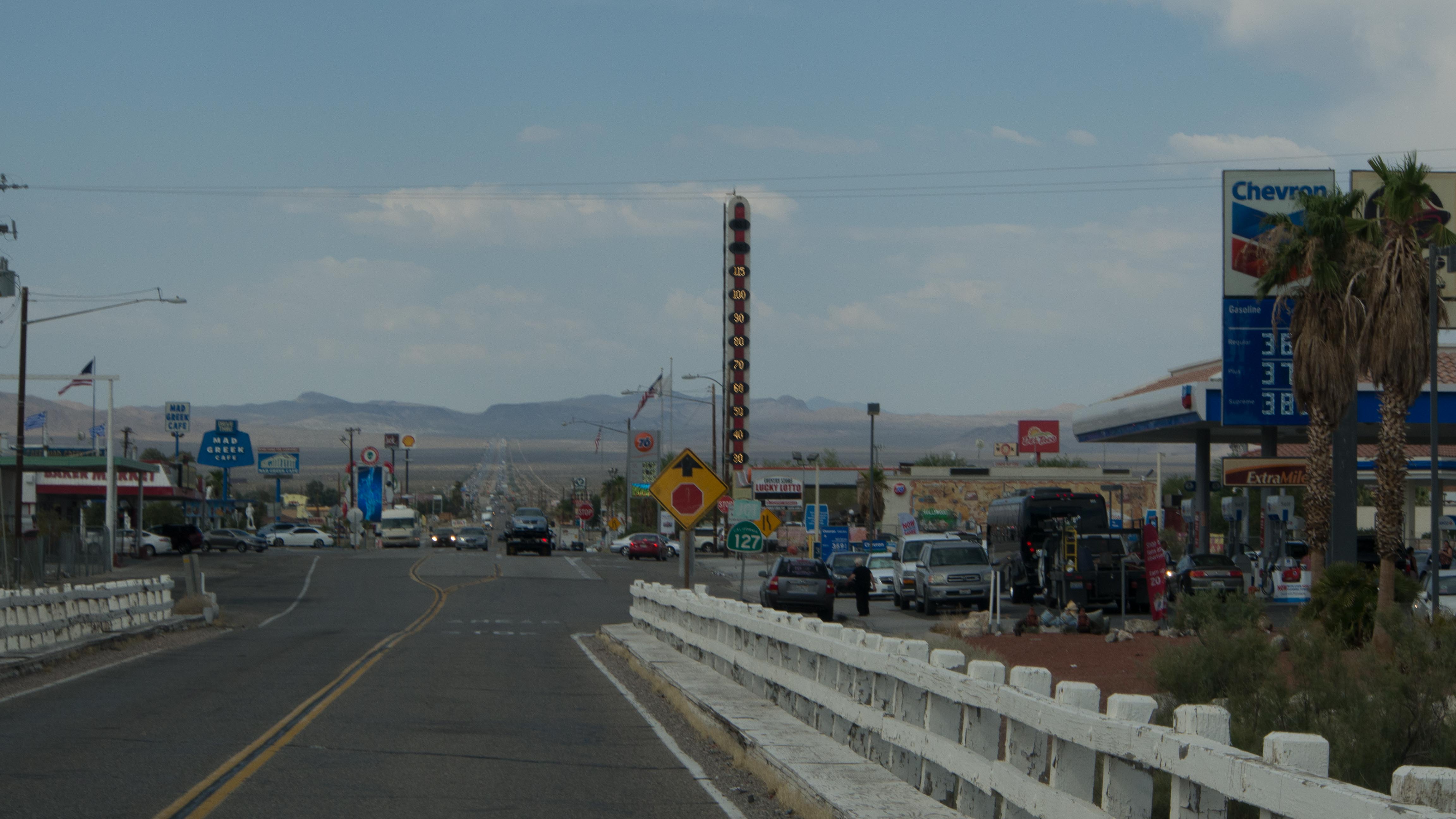 Der Westen der USA und auch wir leiden derzeit unter einer Hitzewelle. Wir sind am größten Thermometer der Welt vorbeigefahren, das zeigte 115 Grad Fahrenheit, das sind mal locker 46 Grad Celsius. Da freut man sich, dass das Auto eine Klimaanlage hat.