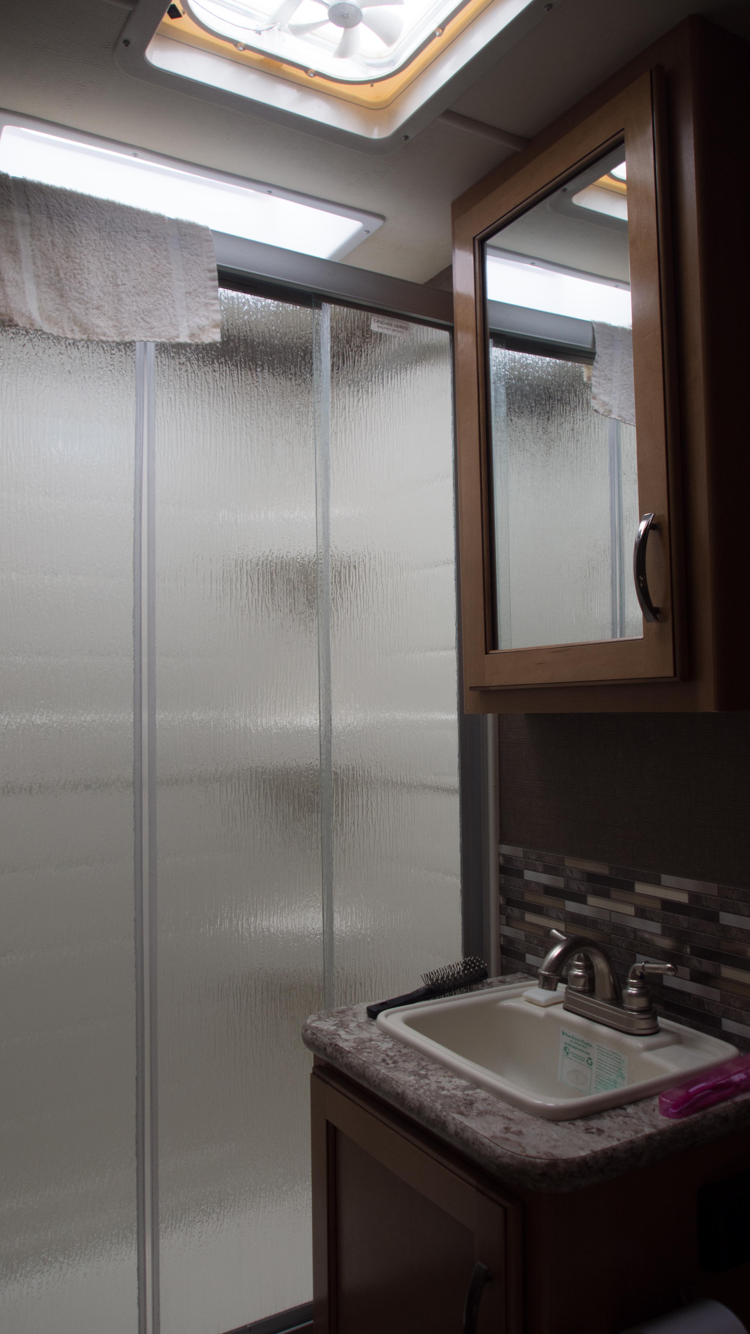 Und ich hatte noch ein Bild vom Badezimmer versprochen. Die Dusche war tatsächlich praktisch für uns, weil wir doch meistens auf Einfach-Campingplätzen ohne Facilities waren. Die Toilette ist rechts, passte nicht aufs Bild.